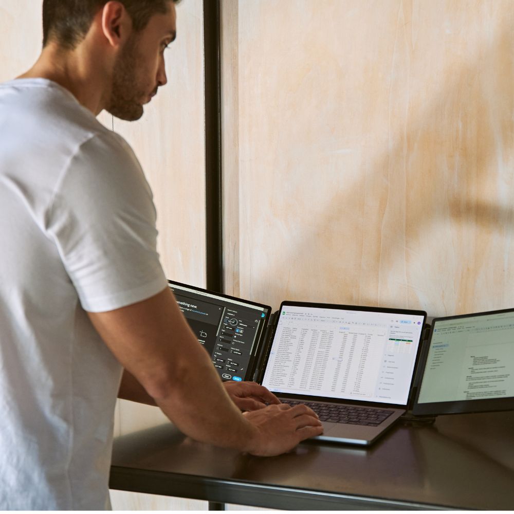 We zijn steeds vaker onderweg, business trips, flex werkplekken, klanten bezoeken, noem het maar op. Het werken op een enkele laptop-monitor verminderd je productivtijd on the go. Switchen tussen tabbladen, consentratie problemen etc. Hier komt de Alpha pro 14.1" portable monitor goed van pas. stop je gemakkelijk je volledige werkplek in je tas. Licht in gewicht en gemakkelijk aan te sluiten door zijn plug en play ontwerp. Zo heb je altijd 3 beeldschermen onderweg. En kan je écht waarde uit je tijd halen.
